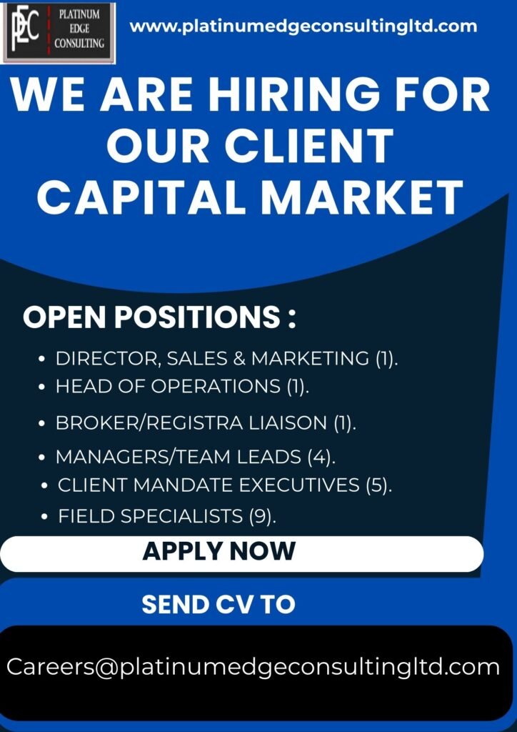 Send your CV to careers@platinumedgeconsultingltd.com to apply