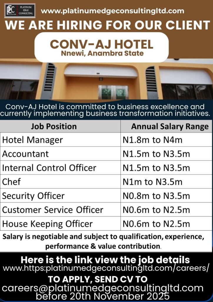 WE ARE HIRING FOR OUR CLIENT – CONV-AJ HOTEL, NNEWI, ANAMBRA STATE